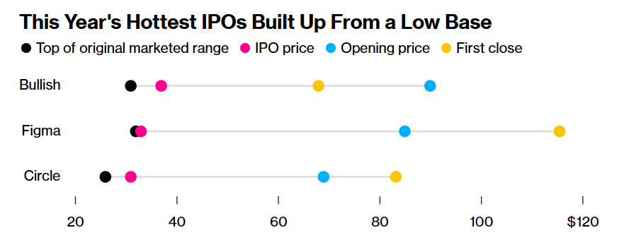 “这绝对是一个新范式,”曾参与Bullish IPO的华尔街金融巨头杰富瑞金融集团的TMT资本市场负责人Becky Steinthal表示。“加密货币、人工智能以及其他面向全球消费者们的流行词板块肯定会看到最为极端的散户投资者需求,发行人现在开始选择让散户在IPO流程中的占比高于历史平均水平,”她强调。“这一切都由科技热潮以及需求所驱动。”