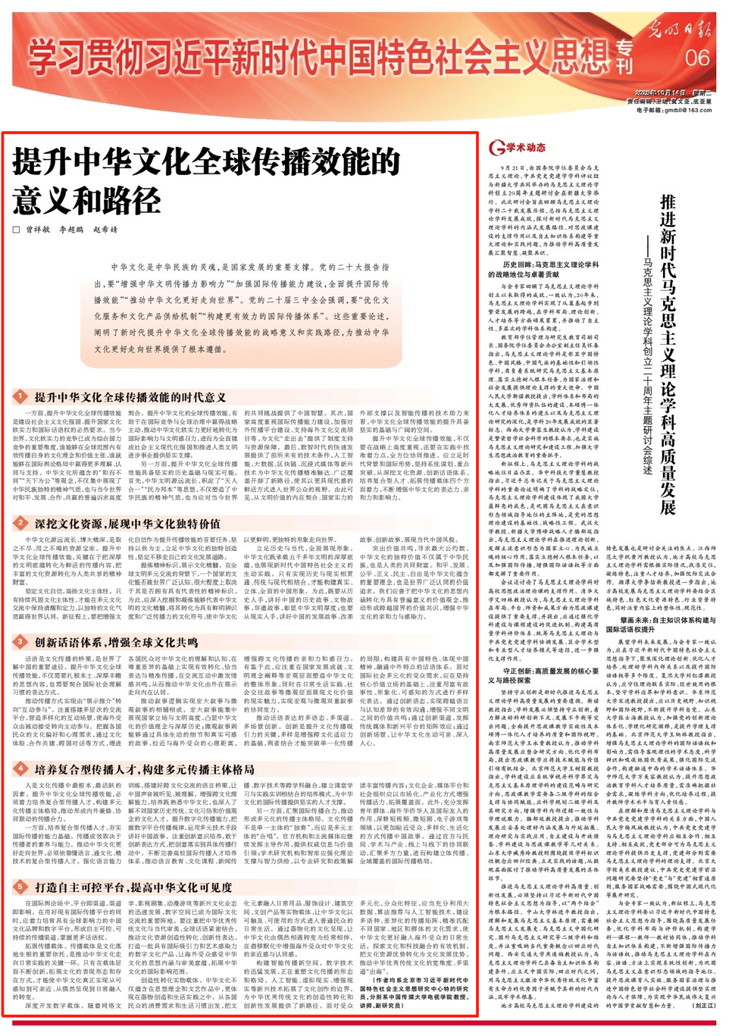 坚定文化自信,高扬文化主体性。只有持续巩固文化主体性,才能在多元文化交流中保持清醒和定力,以独特的文化气质赢得世界认同。新征程上,要把增强文化自信作为提升传播效能的首要任务,坚持以我为主,立足中华文化的独特创造性,坚定不移走自己的文化发展道路。