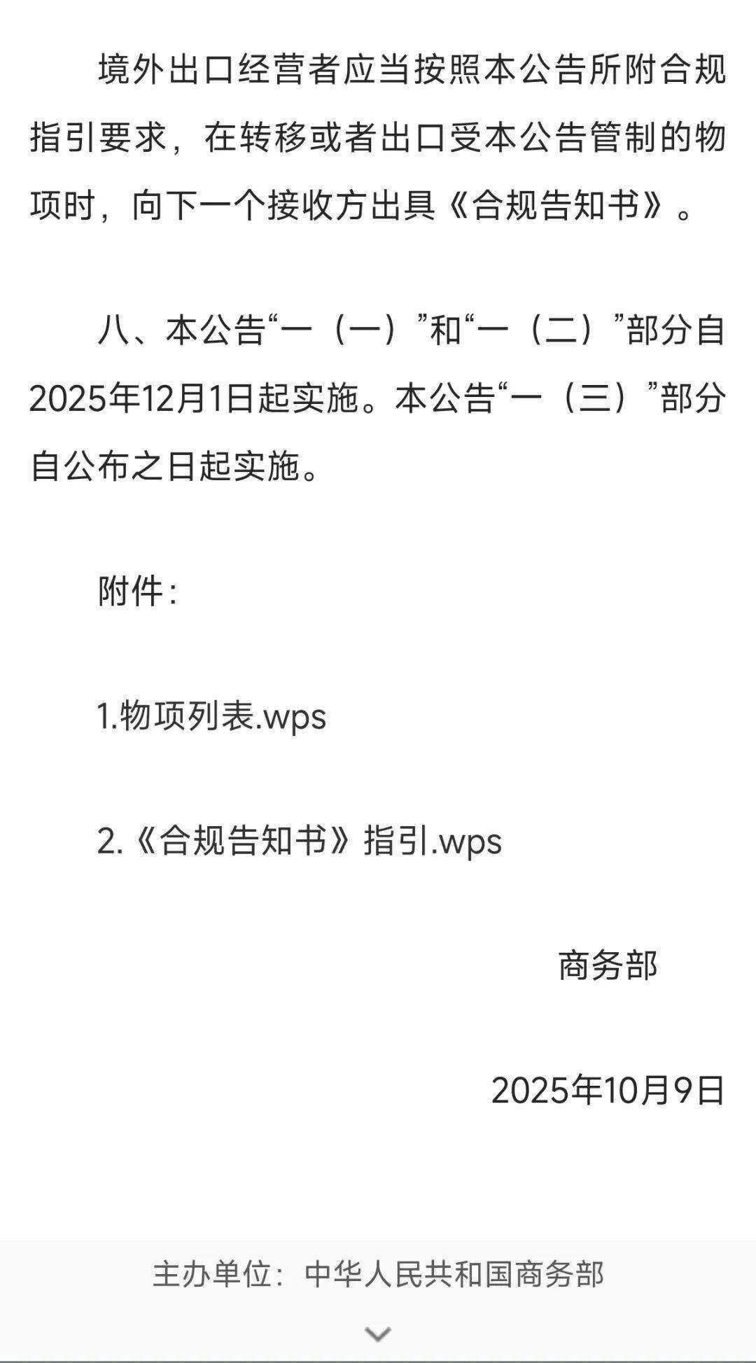 10月12日,“商务部公告附件首次改为wps格式”词条登上微博热搜。商务部10月9日发布2025年第61号公告,对含有中国成分的部分境外稀土相关物项实施出口管制。除管制规则外,附件采用wps格式,申请文件须以中文提交两大细节引发热议。据悉,此前公告附件都是word或pdf格式。