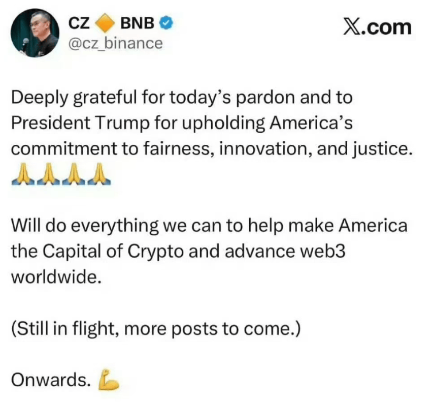 获得特赦后,赵长鹏迅速发声感谢特朗普,并承诺“将全力帮助美国成为加密货币之都”。这番表态的落脚点意味深长——无论个人如何翻盘,最大的赢家终将是美国。