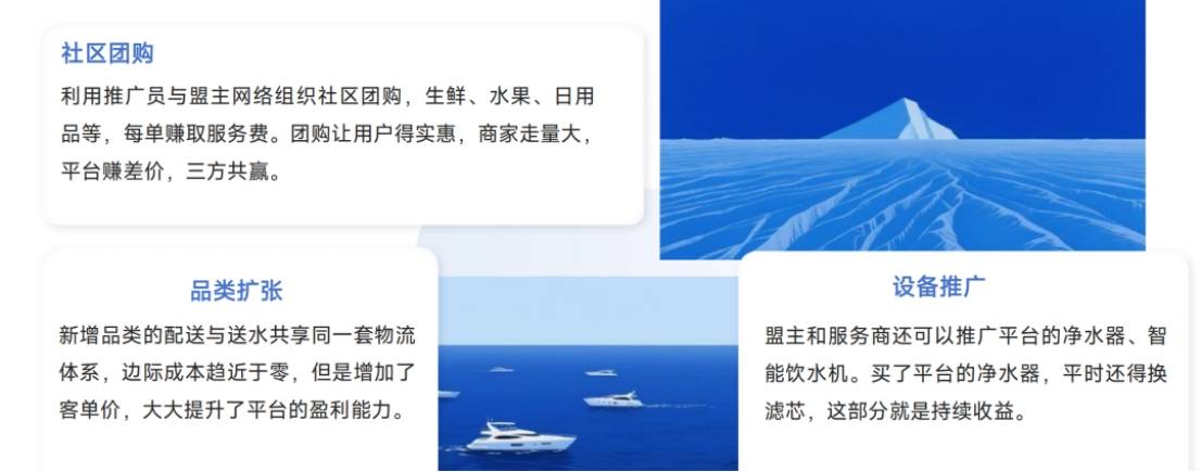青蓝的真正野心,藏在送水之后。当用户形成信任,平台立即推送净水器、粮油等商品。其中净水器佣金高达60%,滤芯复购率超80%,形成持续收益闭环。