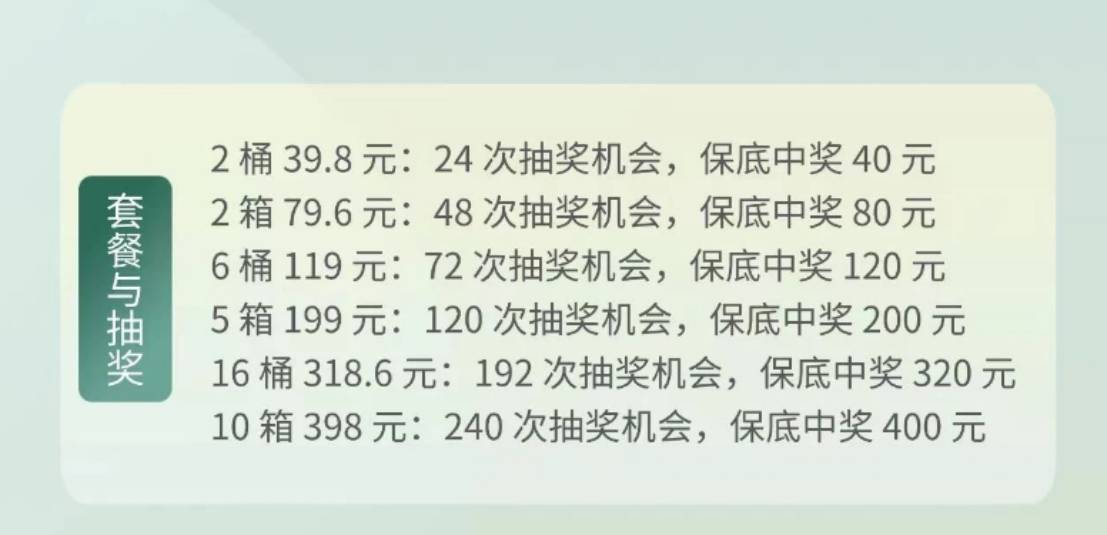 用户支付39.8元获得24瓶水,通过24天每日抽奖全额返现。按此计算,一个家庭最多可免费获得696瓶水,足够饮用一年。