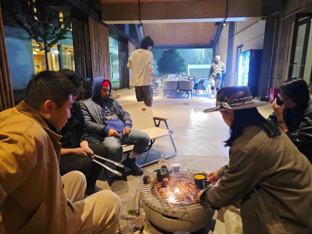 晚上8点钟,天气有点冷了。在浙江省湖州市安吉县溪龙乡横山村的DNA社区,透过落地窗可以看到静音办公室里还有不少人在工作。主理人梭梭在大屋顶下点起篝火,正聊着,陆续有人加入进来,有人烤肉串,有人玩火把,话题聊得很“飞”。大院子里的灯突然亮起,飞盘游戏开始。
